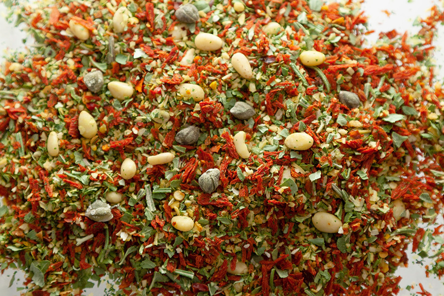 Miscela di spezie dal sapore deciso e particolarmente aromatico: fiocchi di pomodoro (pomodoro e amido di mais), cipolla, pinoli, paprica, aglio, prezzemolo, origano, capperi, peperoncini, pepe, olio di semi di girasole, granelli di buccia di limone, spezie ed olio di limone. Miscela dal gusto mediterraneo ottima per insaporire i piatti classici della cucina italiana: pizza, pasta, salse e sughi.