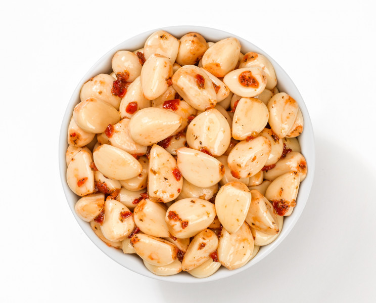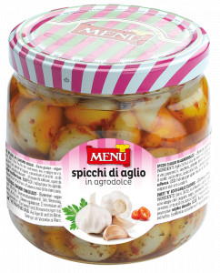 Croccanti spicchi d’aglio marinati in agrodolce e conditi con erbe aromatiche e spezie. Ottimi per aperitivi, buffet ed in abbinamento a salumi.
