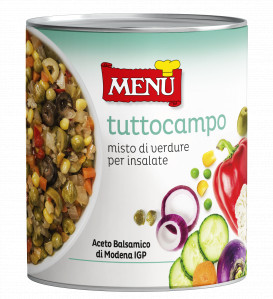 Nove varietà di ortaggi: piselli, cipolline, finocchi, rape, carote, sedano, cetrioli, cavolfiori, peperoni rossi e gialli, con aggiunta di olive verdi e nere a rondelle, mais, capperi, olio, aceto balsamico di Modena I.G.P. e succo di limone.