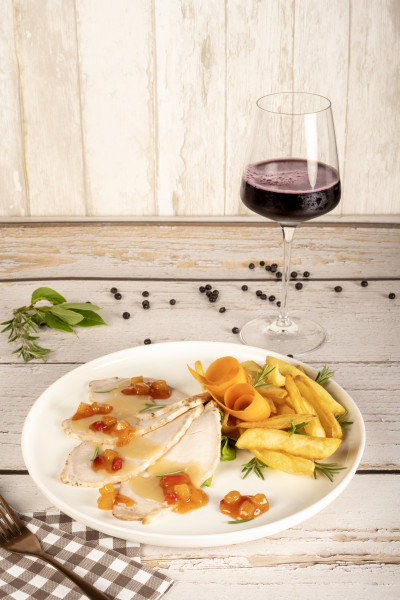 Condire la misticanza con olio evo, sale e pepe e disporla al centro del piatto. Tagliare la lonza di maiale a fette di spessore 3 mm e scaldarla nella salsa di fondo bruno allungata con un goccio di acqua e aromatizzata al rosmarino. Glassare la carne con la salsa e disporre l’arrosto nel piatto a raggiera adagiandola sulla misticanza. Glassare con la salsa di carne e completare con chutney di peperone e ananas. Completare il piatto con patate arrosto o fritte. Guarnire con aghi di rosmarino.
