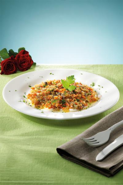 Insaporire la carne cospargendone la superficie con il Sale alle erbe, quindi trasferirla in una pirofila insieme a un poco d’Olio extravergine di oliva. Cuocere in forno la fesa di tacchino a 190° per 25-30 minuti. Sfornare la carne e farla raffreddare, avendo cura di tenere da parte il sugo di cottura. Nel frattempo in una casseruola sciogliere a fuoco moderato i Filetti di acciughe insieme a un poco d’Olio extravergine di oliva; aggiungere i Capperini , lo zucchero e il Soffritto ben scolato dall’olio di conservazione. Incorporare anche il sugo dell’arrosto e sfumare con l’aceto, continuando a cuocere per 10 minuti. Insaporire la salsa con un pizzico di sale e prezzemolo tritato, poi lasciarla in frigorifero fino al raffreddamento. A questo punto affettare l’arrosto di tacchino e accomodarlo nei piatti; distribuirvi sopra la salsa alle verdure e decorare con qualche Capperino. Completare con altro prezzemolo tritato e un filo d’Olio extravergine di oliva a crudo.