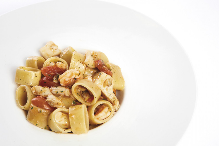 In una padella rosolare l’aglio con l’Olio extravergine di oliva. Appena si è rosolato, togliere gli spicchi d’aglio, aggiungere Èmaremix e il Sugo ai pomodorini datterini. Nel frattempo cuocere la calamarata in abbondante acqua salata, scolare e saltare per pochi minuti con il sugo preparato.