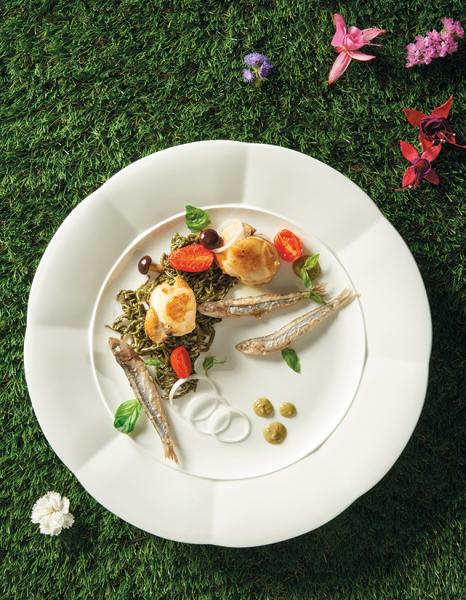 Cuocere alla piastra le capesante con Olio extra vergine di oliva. Salare e pepare. Friggere in abbondante olio bollente le alici infarinate, adagiarle su carta assorbente e salarle. Insaporire Èsalicornia in padella con Olio extravergine di oliva, mezzo spicchio d’aglio, sale e pepe. Appassire in forno i pomodori datterini con Olio, sale, pepe e poco zucchero. Rosolare i pioppini in padella con mezzo spicchio d’aglio, Olio extravergine di oliva, sale e pepe. Adagiare Èsalicornia sul piatto di servizio, adagiare le capesante cotte alla piastra, le alici, i pomodorini e i funghi. Condire con Olio extravergine di oliva e guarnire con piante aromatiche fresche.