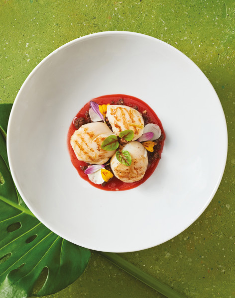 In una bowl inserire il burro freddo da frigo, la farina, il cacao, le mandorle, lo zucchero e il sale. Impastare il tutto fi no ad ottenere un composto compatto e leggermente sgranato. Stenderlo su una teglia con carta da forno e cuocere a 160°C per 15 minuti circa. Nel frattempo pulire le capesante, tamponarle con carta assorbente e condire con Olio, sale e pepe. In una padella calda aggiungere l’olio extravergine d’oliva e scottare le capesante qualche secondo per lato. In un piatto versare a specchio la Coulis di fragole, aggiungere il crumble salato sbriciolato e a seguire posizionare le capesante. Decorare con fiori eduli, o erbette fresche a piacere, aggiungendo a crudo un filo di olio extravergine d’oliva.