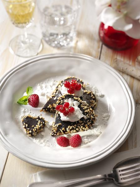 Impastare il Preparato in polvere per Salame al cioccolato insieme al rum e alle uova secondo le modalità indicate sulla confezione. Stendere il composto ottenuto sulla spianatoia e con l’aiuto di un coppapasta sagomato ricavarne 30 cuori al cioccolato. Distribuire la granella di nocciola lungo il bordo dei cuori. A questo punto nella planetaria montare per cinque minuti il Preparato in polvere Dolcefreddo insieme alla panna fresca; trasferire in freezer il composto ottenuto e lasciar riposare per un paio d’ore. Accomodare due cuori di cioccolato su ciascun piatto e sistemarvi sopra due quenelles di Semifreddo. Completare con ribes e lamponi freschi e una spolverata di meringhe sbriciolate.