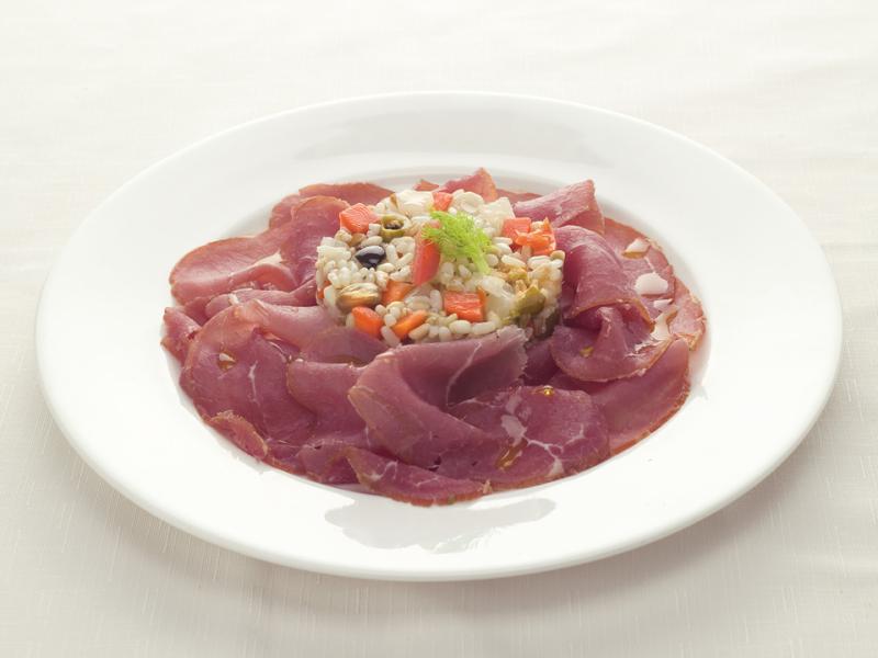 Cuocere il riso e l'orzo in abbondante acqua salata e lasciarli raffreddare. Nel frattempo scolare e sciacquare il farro ed il tuttocampo. Mescolare tutti gli ingredienti aggiustando di sale e pepe. Disporre le fettine di  carne salada su un piatto e posizionare al centro l'insalata di riso. Condire con olio extravergine d'oliva, sale e pepe.