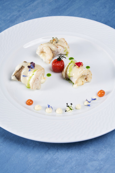 Preparare per prima cosa la coulis di pomodoro. Scolare i Mini Red e frullarli con un frullatore ad immersione, incorporando la gomma di Xantano (0,3 g per 100 g di prodotto), quindi inserire il composto ottenuto in un biberon. Salare poi il pesce bandiera, condire con Olio extravergine di oliva e adagiarvi al centro la mozzarella. Chiudere l’involtino arrotolando e fermando con uno stuzzicadenti. Infornare su carta da forno a 180°C per dieci minuti e lasciare intiepidire. Tagliare in due l’involtino e adagiarlo al centro del piatto aggiungendo un po’ di Coulis di Limone Primofiore. Decorare il piatto con gocce di Maionese, gocce di coulis di pomodoro, petali di Flower Mix Blu e olio al prezzemolo*.