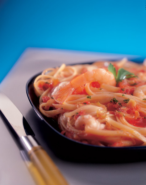 Affettare sottilmente due dita dalla testa del porro e far appassire dolcemente in padella con due cucchiai d’olio. Aggiungere il sugo all’arrabbiata e intanto far rinvenire i gamberetti in acqua fredda. Aggiungerli al sugo, con qualche foglia di basilico spezzettata. Cuocere le linguine al dente e farle poi saltare nel sugo all’arrabbiata con i gamberetti. Spolverizzare di prezzemolo tritato e irrorare con un filo d’olio d’oliva crudo.