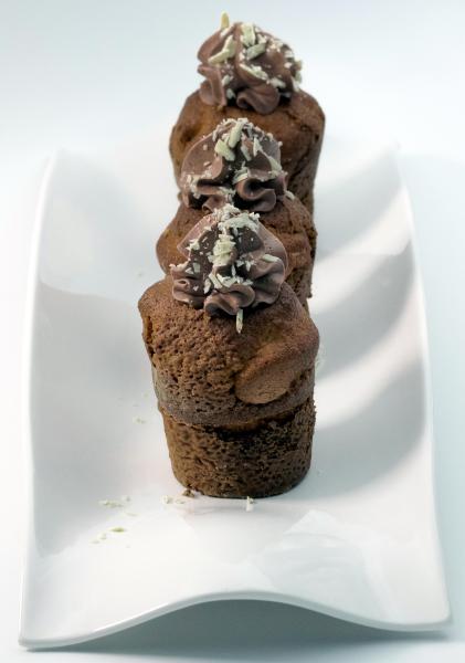 Mettere a bagno l’uvetta per mezz'ora in acqua tiepida. Montare il preparato in polvere per torta margherita con le modalità indicate nella confezione. Scolare l’uvetta molto bene e passarla in un po' di farina. Miscelare delicatamente l’uvetta al preparato. Versare il composto negli stampi da muffin precedentemente imburrati (circa 70 g. ognuno) e cuocere i muffin in forno preriscaldato a 180°C per circa 10 minuti. Nel frattempo preparare la mousse al cioccolato menù montando il preparato con il latte freddo seguendo le dosi riportate sulla confezione. Sfornare i muffin e farli raffreddare. Praticare una piccola incisione al centro del muffin e decorare con un ciuffo di mousse. Ultimare con delle scaglie di cioccolato bianco e servire.