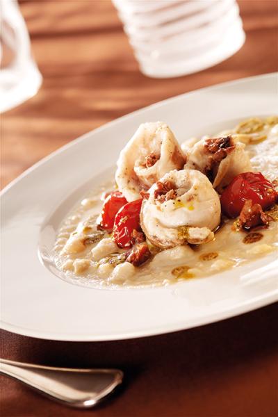 Preparare il brodo utilizzando il prodotto Menù secondo le dosi e le indicazioni riportate sulla confezione. Sfilettare e deliscare i branzini. Con l'aiuto di un coltello rifilare i sei filetti ottenuti e tagliarli a metà per il lungo, avendo cura di lasciarne unita un'estremità. Su di una placca rivestita di carta forno sistemare i filetti di pesce a forma di nidi, quindi condirli con un filo d'olio extravergine, pepe e sale. Infornare a 180° per dieci minuti. Con il mixer passare a crema i fagioli cannellini. Metterli sul fuoco e diluire con un poco di brodo, poi stenderli a specchio su ciascun piatto. Accomodarvi al centro i nidi di branzino e decorare con le olive precedentemente sminuzzate e i pomodorini Dorati. Completare con il pesto alla genovese diluito e servire.
