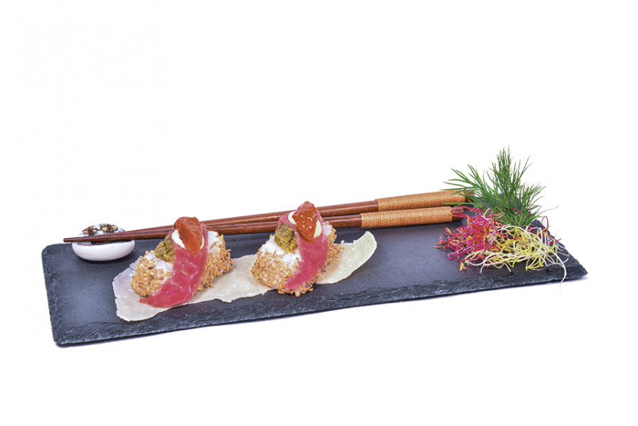 Mescolare la crema di aneto con metà del prodotto Maionese della Casa. Aggiungere ai nigiri di riso il composto ottenuto, quindi ultimare con la fettina di carne. Ricoprire i nigiri con i Semi di sesamo e decorare con Maionese della casa ed un pomodoro Soleggiato.