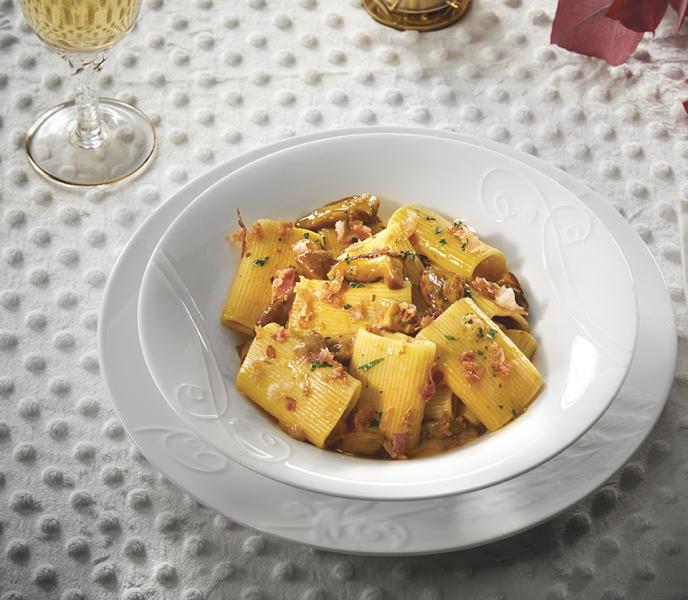 In una casseruola rosolare un po’ d’aglio con un fi lo d’Olio. Aggiungere i Funghi Gran Boletus e il prezzemolo tritato, scaldare per pochi minuti. Cuocere i paccheri in abbondante acqua bollente salata. Sbattere le uova in una ciotola con una manciata di Parmigiano, il sale e una grattugiata di pepe. Quando la pasta sarà cotta al dente, saltarla con i funghi. Togliere dal fuoco e aggiungere le uova legando il tutto. Impiattare e ultimare con un po’ di prezzemolo e pancetta abbrustolita.