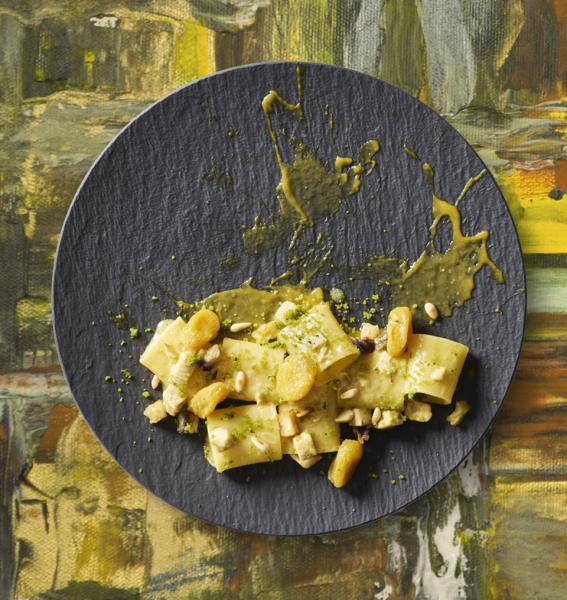 e salarle leggermente. Una volta cotti i paccheri saltarli col sugo di pesce spada. Impiattare, partendo stendendo la crema di Mini yellow sul piatto. Adagiare i paccheri sul piatto e terminare con i pinoli tostati, le melanzane fritte, qualche Mini yellow e il pane verde tostato.