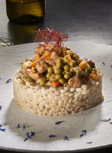 Cuocere in abbondante acqua salata l’orzo. Quando sarà cotto scolarlo e formare con il coppapasta delle basi circolari dello spessore di alcuni cm. Scaldare le ÈpepiteVeg per pochi minuti. Posizionare l’orzo su  di un piatto di portata, aggiungendo le pepite sopra. Ultimare decorando con dei fili di peperoncino e dei fiori misti per decorazione.