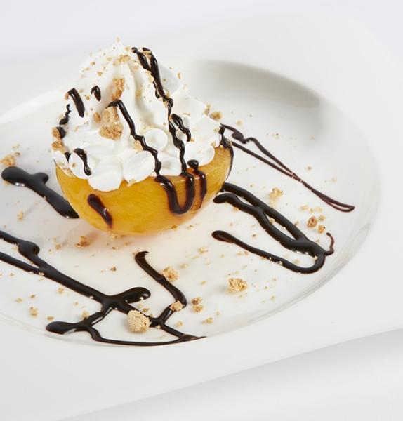 Preparare la mousse allo yogurt seguendo le indicazioni riportate sulla confezione e lasciare riposare in frigorifero almeno 2 ore. Scolare le pesche e farcirle con amaretti sbriciolati lavorati con glassa al cioccolato. Riempire le pesche con la mousse allo yogurt e decorare con glassa al cioccolato e amaretti sbricciolati. Servire freddo.