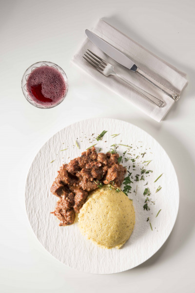 Scaldare a fiamma moderata il cinghiale aggiungendo la polpa di pomodoro. Preparare la polenta seguendo le indicazioni riportate sulla confezione. Versare la polenta sul tagliere e aggiungere il cinghiale.