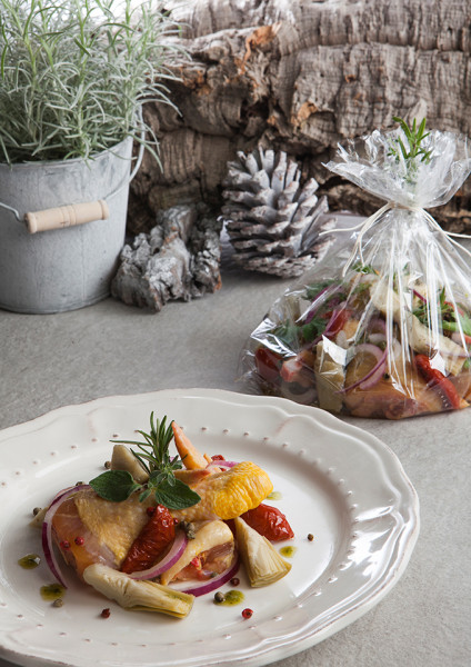 Mettere in una terrina i pezzi di pollo, i pomodori soleggiati, gli spaccatelli dicarciofi, la cipolla precedentemente affettata, il pesto alla genovese, il sale alle erbe e un po’ d’olio. Condire a piacere con gli aromi indicati e mescolare il tutto. Stendere il composto ottenuto nel saccoccio e chiuderlo con l'apposito laccio.