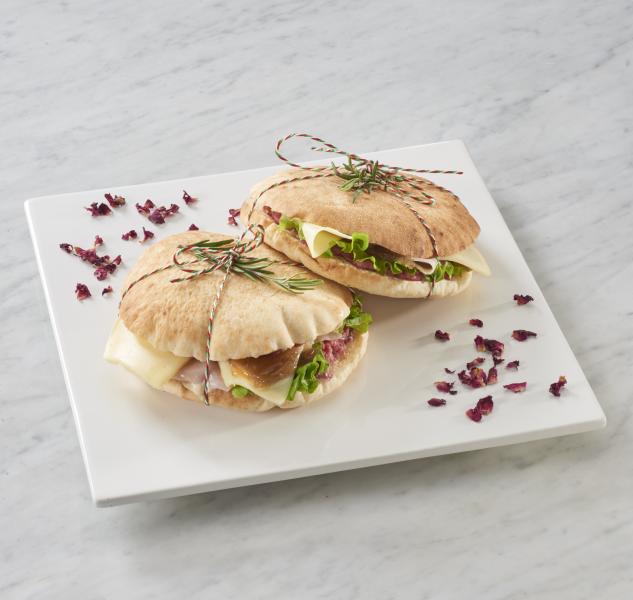Spalmare la crema di formaggio sulla base dei panini. Disporre la carne macinata condita con sale, pepe e Parmigiano sulla base del pane schiacciata di uno spessore sottile in modo da agevolare la cottura, che dovrà essere veloce. Adagiare la fetta di insalata, il prosciutto cotto, le fette di formaggio provola affumicata leggermente ripiegate, la cipolla caramellata e richiudere i panini. Legarli con lo spago decorando con foglie di alloro o rametti di rosmarino