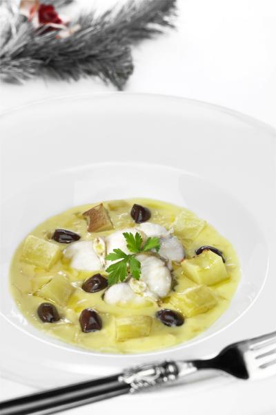 Rivestire una teglia con la carta forno e accomodarvi sopra le fette di rana pescatrice , le patate a cubetti e le olive nostraline; condire con un filo d’olio extravergine e il sale alle erbe. Cuocere il pesce in forno a 170° per 20 minuti. Nel frattempo in una padella scaldare la fonduta insieme alla Gransalsa di porro; distribuire a specchio la crema ottenuta nei piatti, quindi sistemarvi sopra le fette di rana pescatrice, le patate e le olive, poi servire.