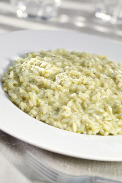 Preparare il brodo utilizzando il prodotto Menù secondo le dosi e le indicazioni riportate sulla confezione. In una casseruola rosolare la cipolla tritata insieme a un poco d'olio extravergine; aggiungere il riso e lasciarlo tostare per alcuni minuti. Versare una parte del brandy e far evaporare, quindi continuare a cuocere inserendo poco alla volta il brodo preparato. Due minuti prima di togliere dal fuoco incorporare il brandy rimasto, il pesto, la Grancrema di Scamorza e il burro. Terminare la cottura e servire il risotto.