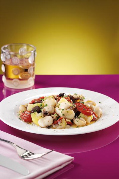 Pulire con cura le seppioline sotto il getto dell’acqua corrente. In una casseruola scaldare un poco d'olio extravergine e farvi rosolare la cipolla e il sedano tritati. Aggiungere le seppioline e cuocere fino a quando si sarà ridotta l'acqua rilasciata dai molluschi. Bagnare con il vino bianco e lasciare evaporare. A questo punto incorporare le patate precedentemente, sbollentate e tagliate a spicchi. Dopo dieci minuti, unire le olive nostraline e i pomodori soleggiati. Aggiustare di pepe e sale, completando la cottura. Spolverizzare con prezzemolo tritato e servire.