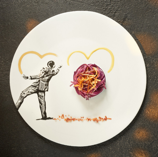 Scottare in un tegame d’acqua bollente alcune foglie di cavolo viola. Quando l’acqua avrà preso un bel colore viola, cuocervi gli spaghetti. Togliere gli spaghetti al dente e saltarli con la Salsa di Cavolo viola. Impiattare gli spaghetti e decorarli con la Fonduta, il porro fritto e il prosciutto precedentemente abbrustolito.