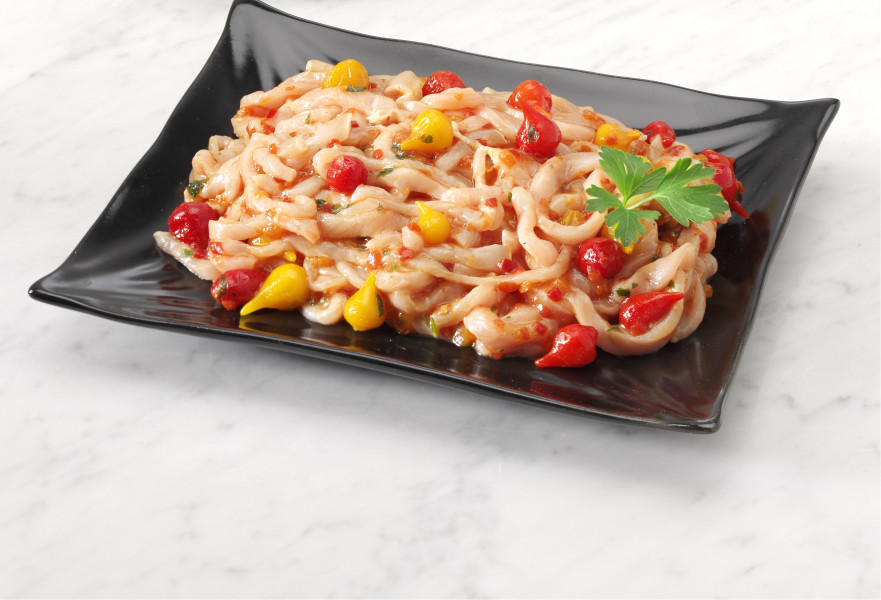 Tagliare a piccoli quadretti il Peperonepronto e unirlo agli straccetti. Aggiungere la Salsa peperoni e arancia in top down e decorare con Peperoncini a goccia rossi e gialli.
