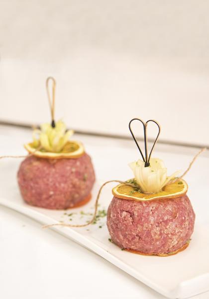 Aggiungere alla carne macinata la Salsarancia (20% rispetto alla quantità della carne), un pizzico di sale e di pepe. Impastare e incorporare i Fiokki, fino ad ottenere una consistenza ideale che ci consenta di formare una palla di carne a forma di tamburo. Mettere una fetta sottile di arancia sulla base e un’altra sulla parte superiore del tamburo, decorare con porro fresco ed erba cipollina.