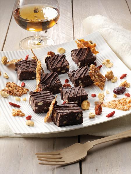 Versare la busta del preparato salame al cioccolato in una planetaria con frusta a foglia insieme a 200 g. di acqua e il liquore. Impastare fino ad ottenere un composto morbido poi compattarlo in una teglia rettangolare (30x40 cm.) rivestita di pellicola o carta forno. Il composto deve poi risultare alto circa 2-3 cm e va lasciato raffreddare in frigorifero per un paio d'ore. Nel frattempo preparare delle scaglie di croccante seguendo le istruzioni indicate nella confezione. Togliere dal frigo la torta, metterla su un piano rigido e tagliere dei cioccolatini quadrati della dimensione di un cremino (2x2 cm.). Adagiare su un piatto 5-6 cioccolatini (150 g. circa ognuno) e decorarli a piacere con la glassa al cioccolato, il croccante a scaglie e la frutta secca spezzettata.